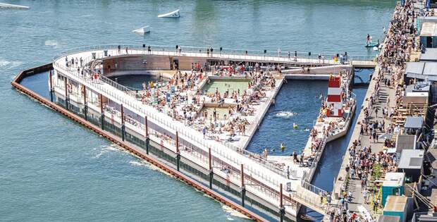 Плавучий искусственный остров для любителей отдыха у воды вмещает до 650 человек одновременно и имеет форму неправильного треугольника, у основания которого вырыт 50-метровый бассейн. У вершины находится еще один, круглый. Между ними теснятся два искусственных водоема.