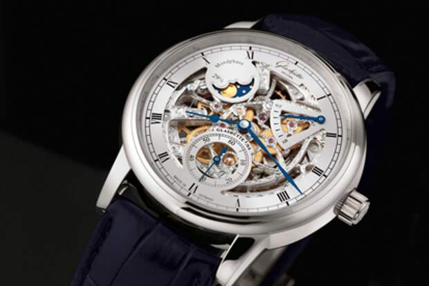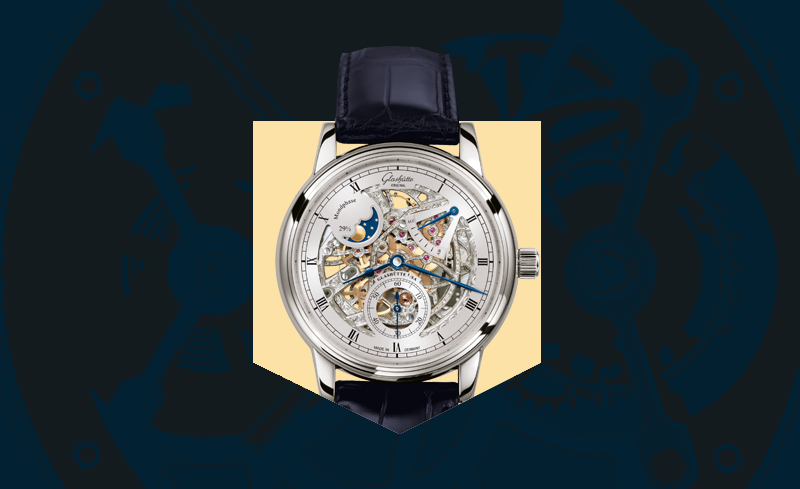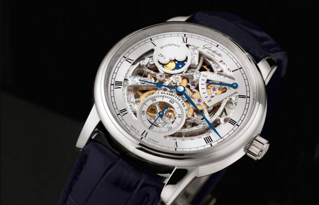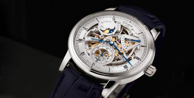 Часам из линейки Senator, пожалуй, нет равных по элегантности среди других моделей Glashütte Original. Кроме филигранно декорированного мануфактурного механизма 49-13, эти часы наглядно демонстрируют и свой функционал. От привычного циферблата сохранились фрагменты, которые служат индикаторами фаз Луны (в позиции «10-11 часов»), малой секунды (на «6 часах») и запаса хода (между отметками «1» и «2 часа»).