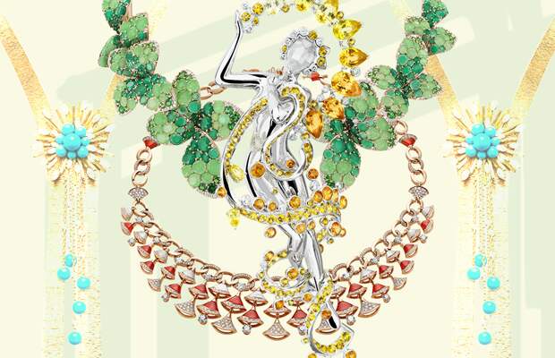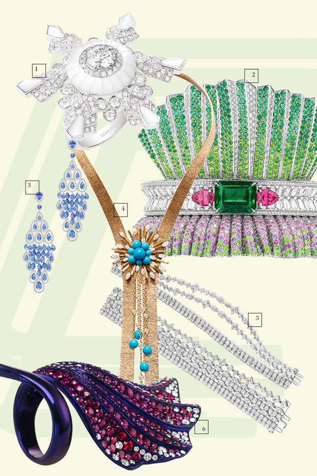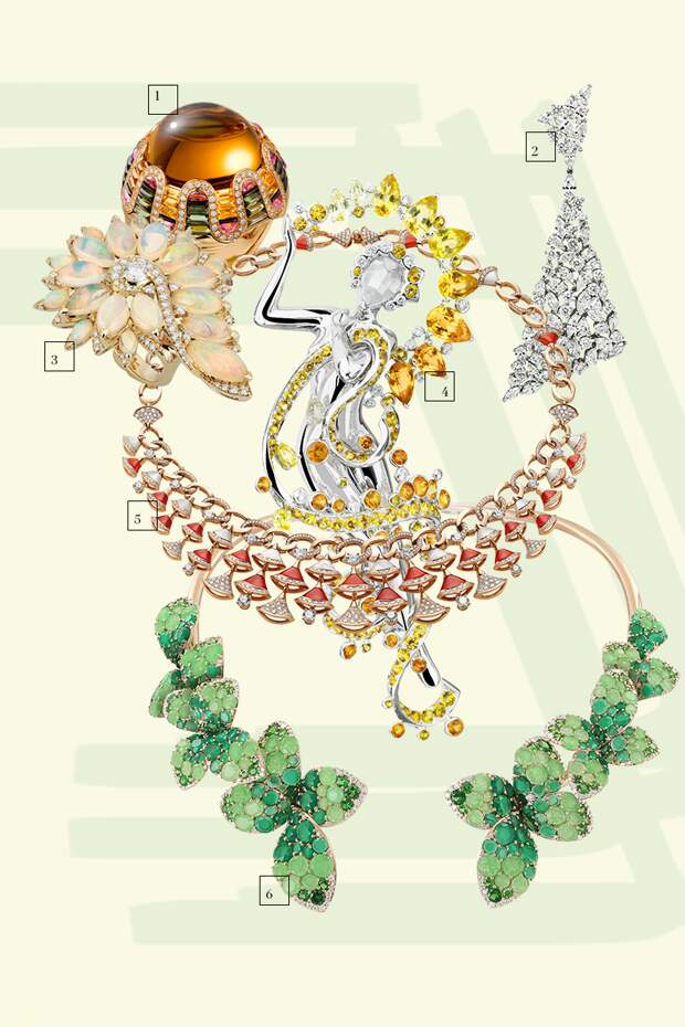 1. Кольцо Etourdissant Cartier, желтое золото, цитрины, зеленые турмалины, оникс, рубеллиты, бриллианты, Cartier. Цена по запросу 2. Серьги Silk, белое золото, бриллианты, Messika. Цена: 3 620 500 руб. 3. Кольцо Magnipheasant, розовое золото, опалы, бриллианты, Stephen Webster. Цена: 1 751 100 руб. 4. Брошь Iris, белое золото, бриллианты, желтые сапфиры, Van Cleef & Arpels. Цена по запросу 5. Колье Divas' Dream, розовое золото 18 карат, сердолик, перламутр, бриллианты, Bulgari. Цена: 5 927 000 руб. 6. Колье Giardini Segreti Haute Couture, розовое золото, жадеиты, агаты, цавориты, бриллианты, …