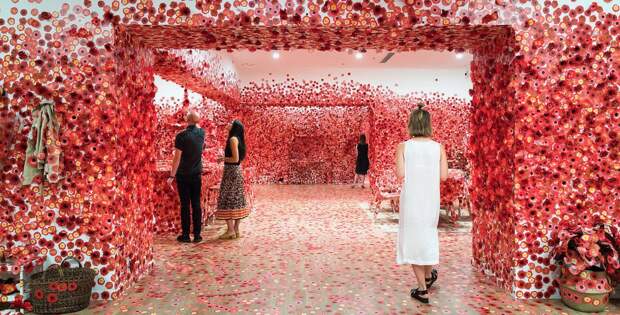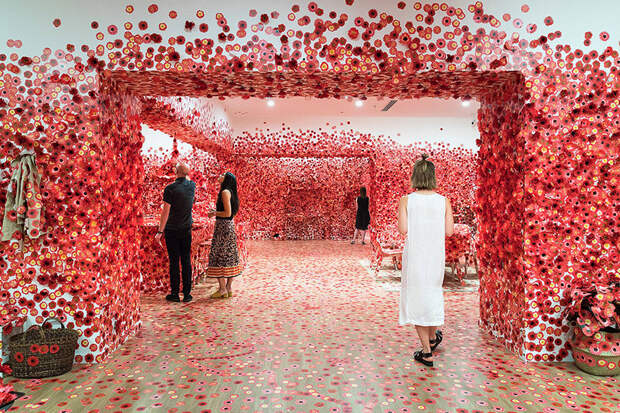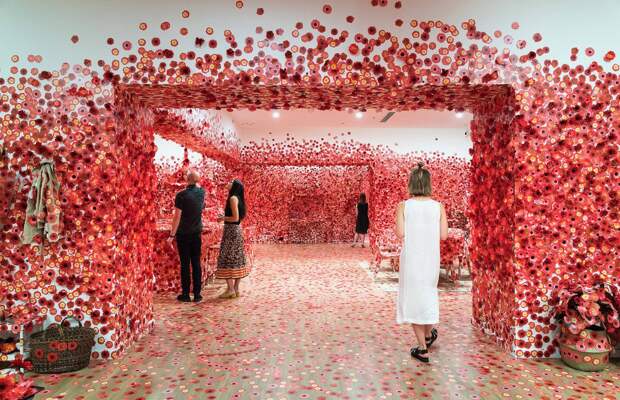 Последнее исследование Кусамы — цветочная одержимость — было представлено на неделе Национальной галереи искусств в Мельбурне (Австралия). Обычная меблированная комната в белых тонах на глазах у посетителей скрылась под ярко красными цветами.