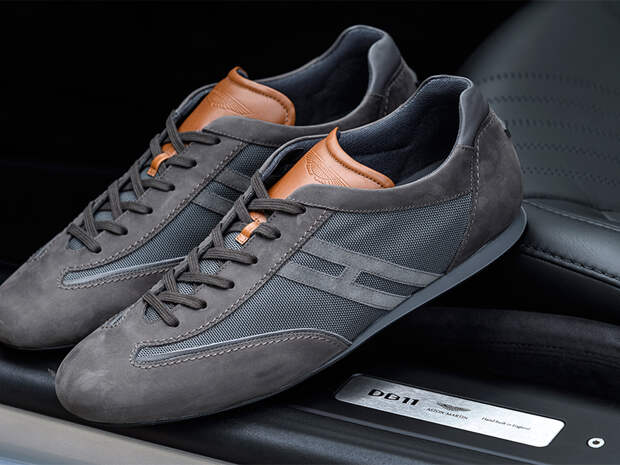 Прочая расцветка выглядит сдержаннее: кроме комбинации коричневого и серого, можно выбрать приглушенный зеленый, темно-синий и черный. Сбоку видны фирменные вытянутые монограммы «Н», отделанные замшей, на язычке тиснением выбит крылатый логотип Aston Martin, любимых авто Джеймса Бонда.