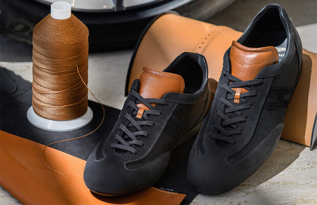 За основу взят базовый дизайн Olympia, легкой и практичной модели на каждый день. Пятка, мысок и верхняя часть отделаны нубуком, боковые вставки изготовлены из нейлона (как и спрятанная под шнуровкой нижняя часть язычка). А для верхней, более широкой и заметной его части, выбрана кожа специальной выделки особого ярко-коричневого оттенка — именно такая используется в салоне легендарных британских спорткаров.