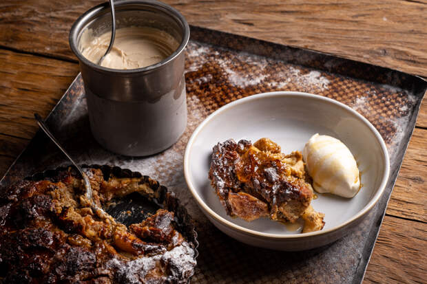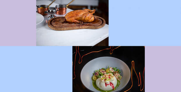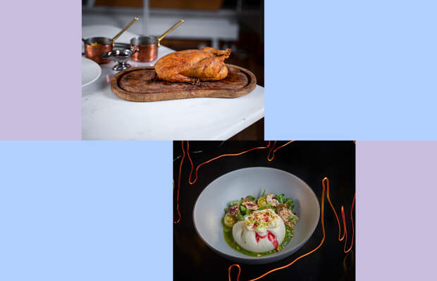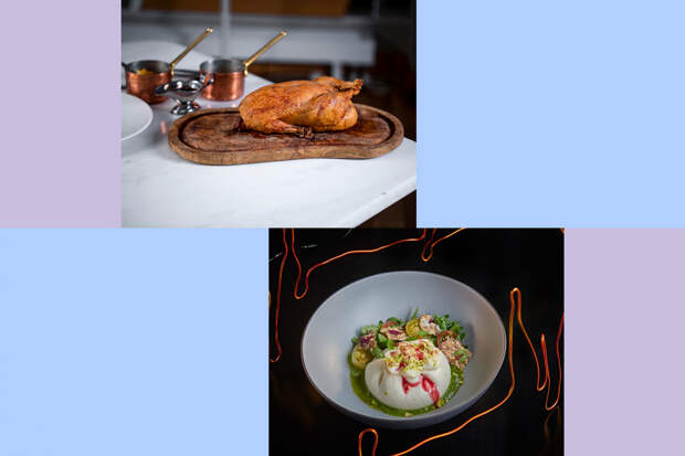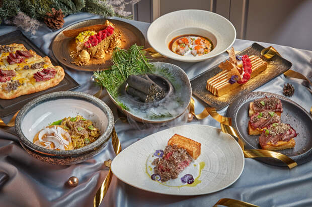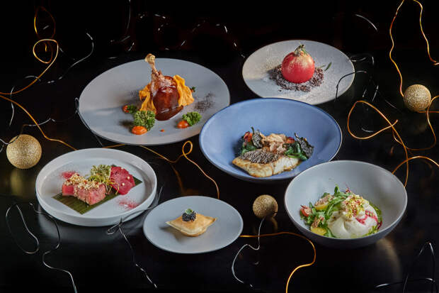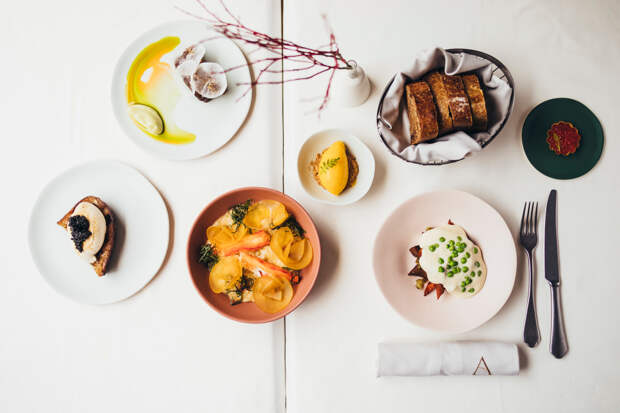 Первый создается из ананасового мусса, лаймово-ананасового ганаша, ванильного и песочного сабле, компоте с кристаллами ананаса и мандаринового пюре. А второй десерт как пазл собирают из банановой намелаки, компоте из карамелизированных бананов, бисквита и хрустящего слоя из сублимированного банана, песочного штрейзеля и молочного шоколада. В меню появились и позиции в жанре геометрического абстракционизма — шоколадно-бисквитная «Вишня», грейпфрутовое «Обнаженное сердце» и gluten-free «Манго-Маракуйя». К праздникам все десерты выполнили в снежно-белой гамме. Цены в районе 400 руб.