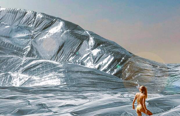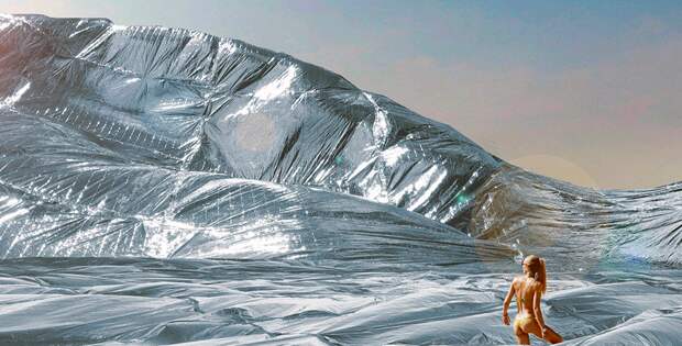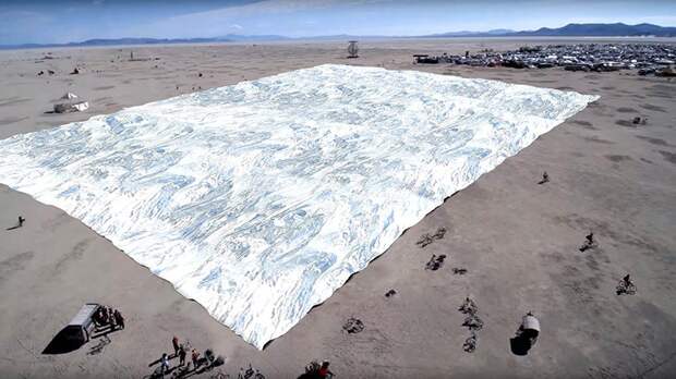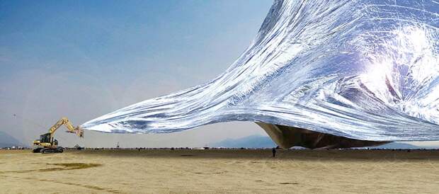 Сверхлегкое полиэфирное полотно, состоящее из 3 350 спасательных или «космических» одеял NASA, «сшито» 40-километровой армированной лентой и занимает площадь в 10 000 кв. м. Серебряное «покрывало» меняет свою форму, образуя искрящиеся на солнце волны и горы или другие силуэты, рождающиеся в воображении. Зеркальная сторона имеет теплоотражающие свойства, так что пространство для отдыха в пустыне Невада во время фестиваля обещает быть прохладным.