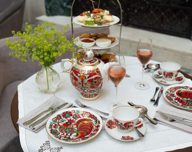 Этим летом «Гранд Отель Европа» приглашает на специальное чаепитие. В кафе «Мезонин» в атриуме стоит стол, накрытый скатертью и салфетками, вышитыми работницами новгородской мануфактуры «Крестецкая строчка». Гостям подают бокал игристого и разнообразные блюда, сервированные на позолоченной посуде Императорского фарфорового завода из серии «Красный петух».