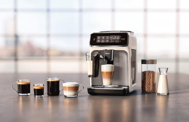 Длина модели — 142 см, а вес — всего 28 кг. Автоматическая регулировка скорости на полотне осуществляется с помощью IQ-сенсоров или с помощью пульта управления. Если включен автоматический режим, то для ускорения темпа достаточно сделать шаг на переднюю часть полотна, а для замедления — на заднюю. На дисплее, расположенном на панели, отображается скорость, дистанция, число шагов и продолжительность тренировки. Приятный бонус — дорожка складывается, так что мешать она точно не будет. Цена новинки 58 880 руб.Кофемашина LatteGo 3200, Philips