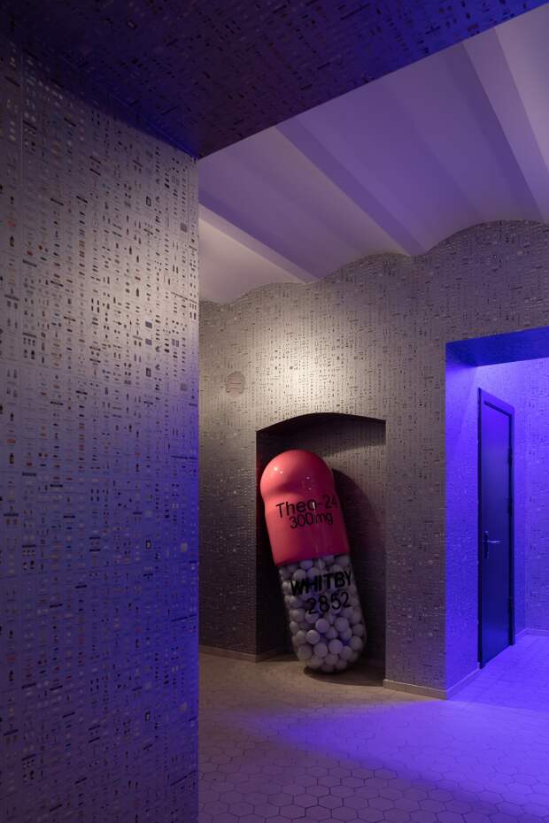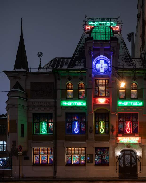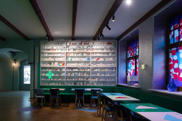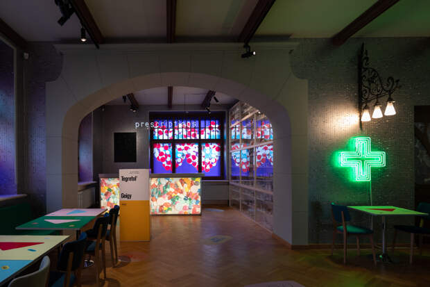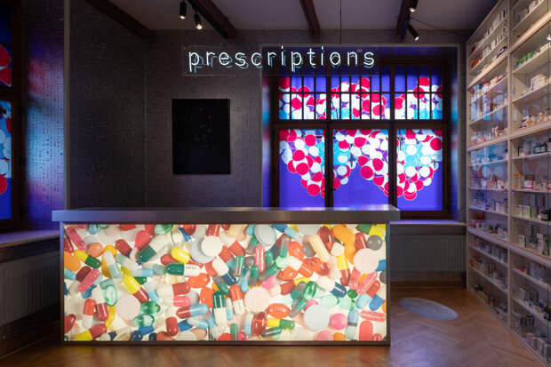 Стараниями дома Prada и художника Дэмиена Херста особняк в стиле модерн в Трехпрудном переулке превратился на некоторое время в «аптеку» от искусства, где задают вопросы, ищут ответы, а вместе с тем выписывают рецепты от хандры сероватых будней. Иными словами, лечат. «Аптека» эта из числа хоть и чудных, но достоверных: вывеска-крестик над входом — неоновая, лекарства — за стеклом и на полках, их ассортимент — впечатляющий.