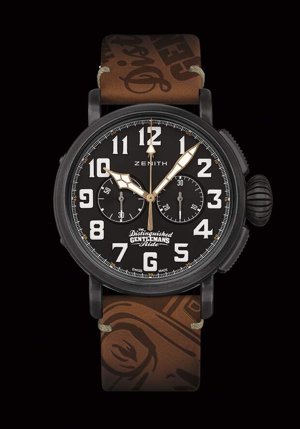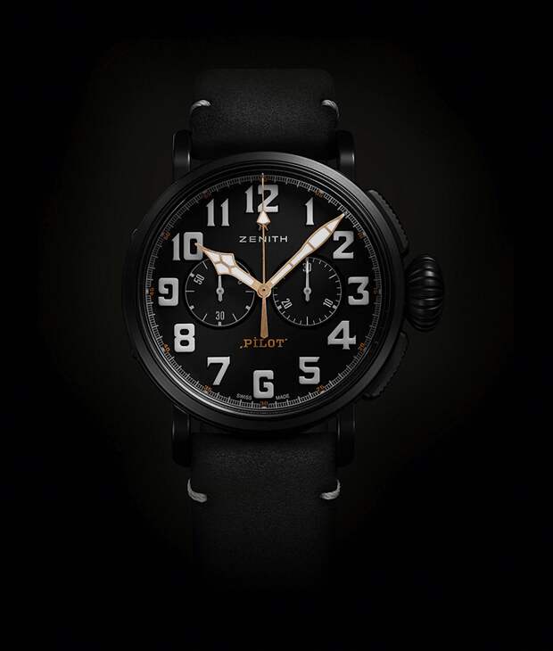 Авиаторская модель с крупными индексами и стрелками на черном матовом циферблате управляется автоматическим калибром El Primero …