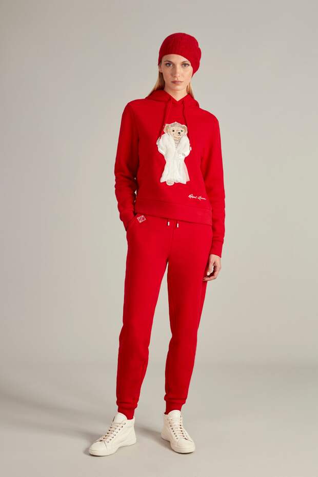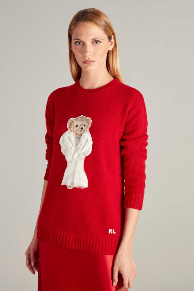 В новой коллекции представлены женские вещи в ярко-красном цвете. На свитере расположилась медведица в вечернем платье с юбкой с оборками из шелкового тюля и верхом, расшитым кристаллами Swarovski. Ее праздничный образ дополняет диадема. На создание медведицы — фирменного элемента коллекции коллекции Purple Label — ушло более 100 часов работы.