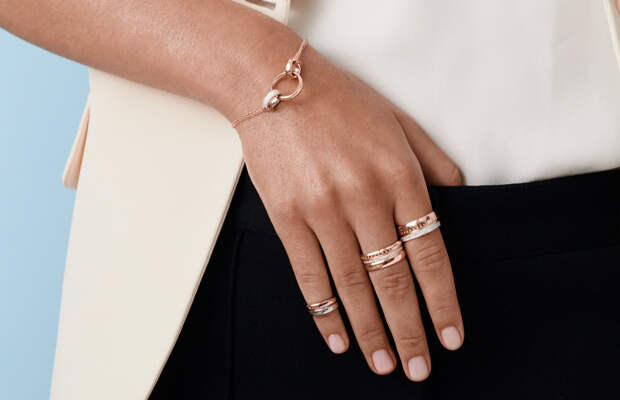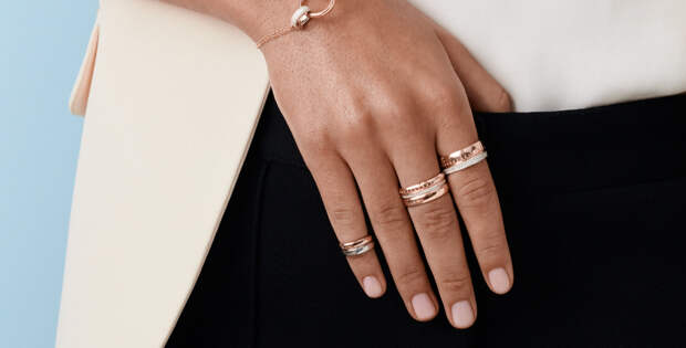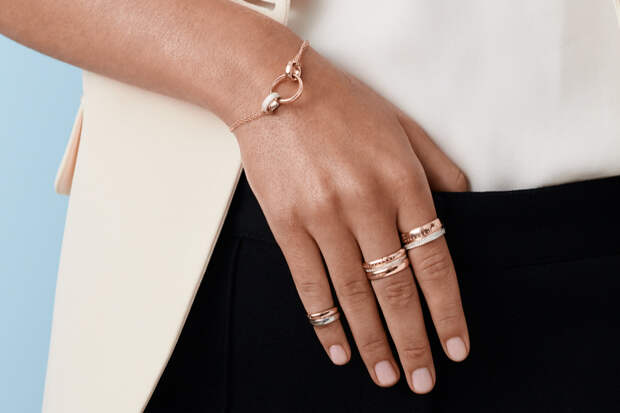 Одна из последних называется Air. Константин Кытин задумал ее как ювелирный конструктор, вдохновленный авиационной эстетикой. Базовый элемент — кольцо — напоминает самолетную турбину в форме округлого треугольника. Ассоциацию с авиацией подчеркивает декоративная штамповка.Из колец разной ширины и размера, изготовленных из белого и розового золота, полированных или покрытых бриллиантами (частично или полностью), составляются другие украшения. Их можно носить сразу несколько.