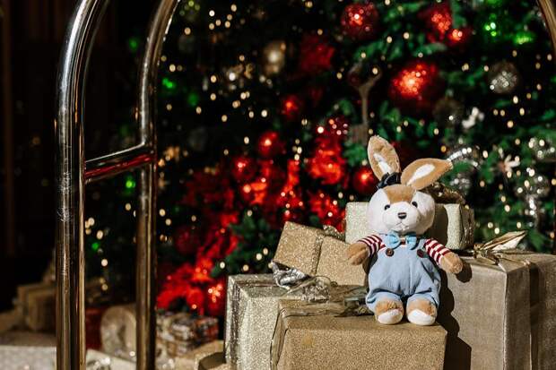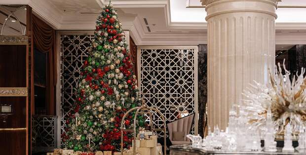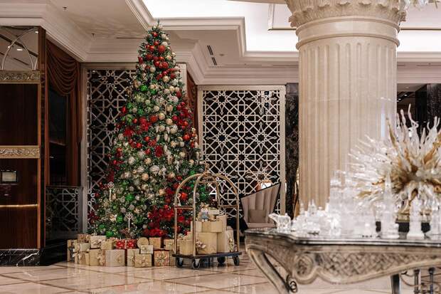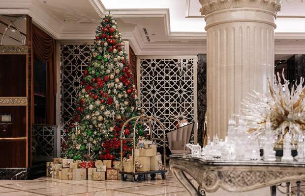 Новогодние декорации «Лотте Отель Москва» (Новинский бульвар, 8, стр. 2) — это настоящая зимняя сказка с огромной елкой, переливающимися гирляндами, красными и золотыми пузатыми шарами, мягкими зайчиками, вкусными комплиментами, попкорном и прохладительными напитками.