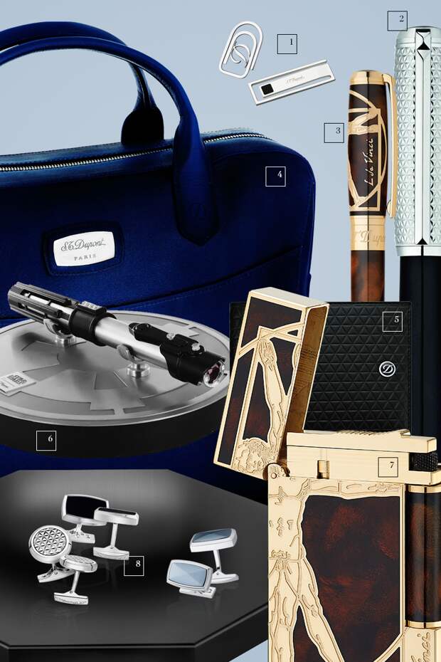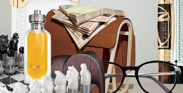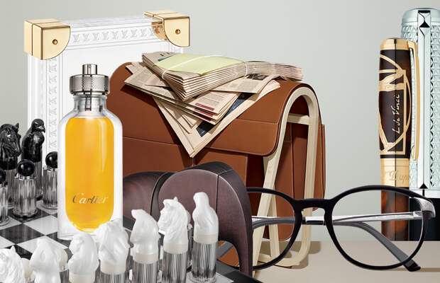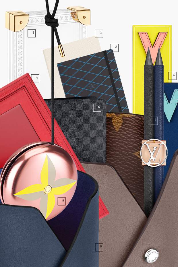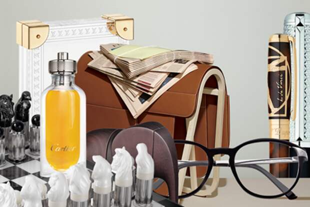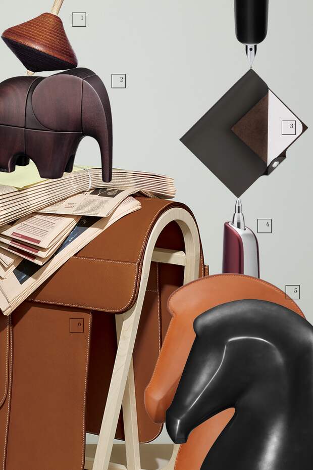 Юла из телячьей кожи и бука, статуэтка в виде слона, органайзер в обложке из телячьей кожи, перьевые ручки, статуэтки в виде лошади, обтянутые кожей, подставка для журналов — все Hermès