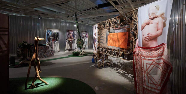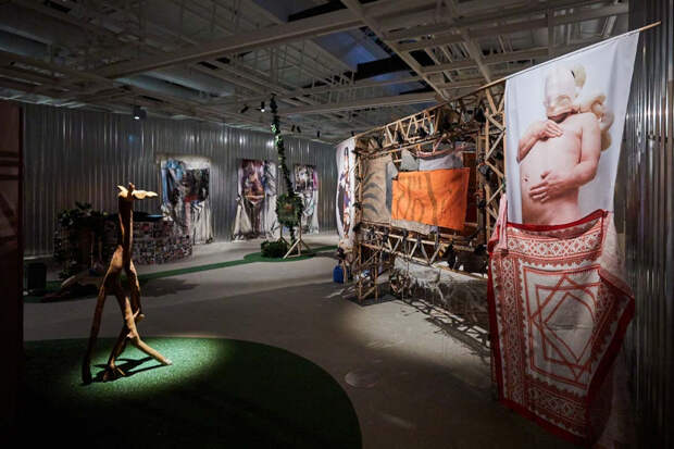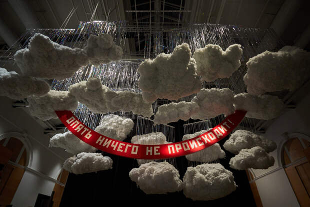 «Опять ничего не происходит!» — встречает на входе в петербургский «Манеж» вознесенное почти под самый потолок и похожее на агитплакат восклицание. Эта инсталляция Маяны Насыбулловой, окружившей свое заявление пышными облаками и игривым новогодним «дождиком», — своеобразный ироничный затакт, ведь в следующие пару часов нам предстоит разбираться, какое оно, современное российское искусство, съехавшееся сюда со всей страны, и что с ним происходит.