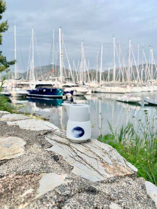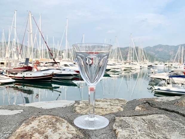 Бокал для красного вина Moser на фоне марины D-Resort Göcek