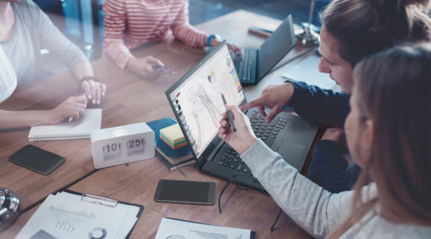 Стенд Lenovo — всегда многозадачный. В одном углу — «козыри» компании, ноутбуки. В этом году на выставку привезли обновленный ноутбук-трансформер Yoga Book C930, который примечателен отсутствием физической клавиатуры. У пионера этой линии ее тоже не было. Однако сейчас на месте клавиатуры не просто ЖК-экран, а электронная бумага и вибромоторчики для тактильных ощущений. Суть осталась прежней: можно печатать под удивленные взоры окружающих, причем вид клавиатуры можно задать нестандартный, под свои нужды. …