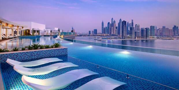 Главное место отдыха — расположенный на крыше отеля 45-метровый инфинити-бассейн. Вид отсюда открывается захватывающий: сверкающие небоскребы района Марина, величественный силуэт «Бурдж-эль-Араб» и бескрайние воды Персидского залива. Температура воды регулируется, что делает бассейн подходящим для плавания в любое время года. Неподалеку расположен лаундж, где подают освежающие напитки и легкие закуски. Особенно популярны у гостей авторские коктейли на основе освежающей мяты, граната и лайма.