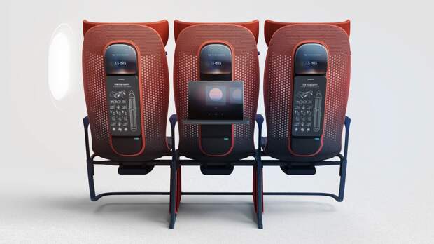 Кресла оформлены умным текстилем, который с помощью датчиков подключается к мобильному приложению. Приложение позволяет получать уведомления, необходимые в полете, а также регулировать положение спинок, температуру кресел и уровень влажности воздуха.