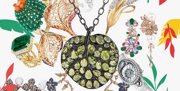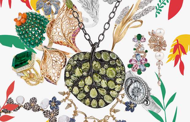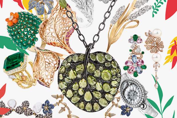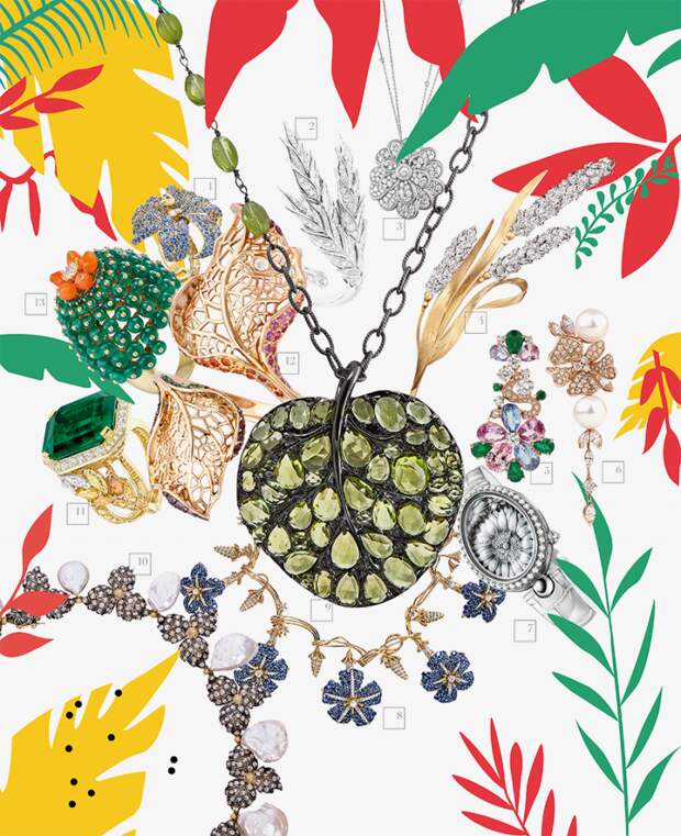 1. Кольцо Flora, Gucci 2. Кольцо Blé d’Eté, Boucheron 3. Подвеска Happy Diamonds, Chopard 4. Брошь Moisson sous le vent, Chaumet 5. Серьги Fiore, Magnificent Inspirations, Bulgari 6. Серьги Fiori d’Arancio, Damiani 7. Часы Reine de Naples, Breguet 8. Колье Masterpieces, Tiffany & Co. 9. Подвеска Botanical Leaf, Michael Aram 10. Колье, Buccellati 11. Кольцо Epi …