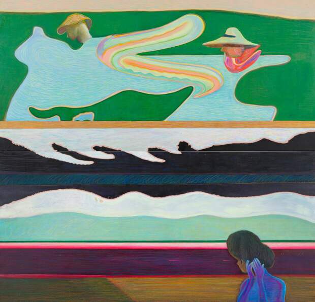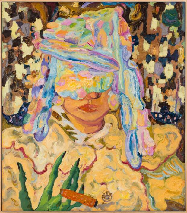 Скалецкий предпочитает кислотные оттенки, малахит, нежную горчицу, винный, золотой, изнеженный розовый, глубокий синий. Краски прошиты полосками и слоями, точно в жевательной резинке. Кстати, одна из работ так и называется — «Турецкая жвачка».Одаренный фантазер с коллажной оптикой, он дает своим холстам столь же парадоксальные названия, разгадывать значение которых — отдельное удовольствие. Чего стоят, к примеру, такие: «Были у нее два поклонника: один любил ее и дарил ей цветы, другого любила она и давала ему деньги» или «Свеча — …