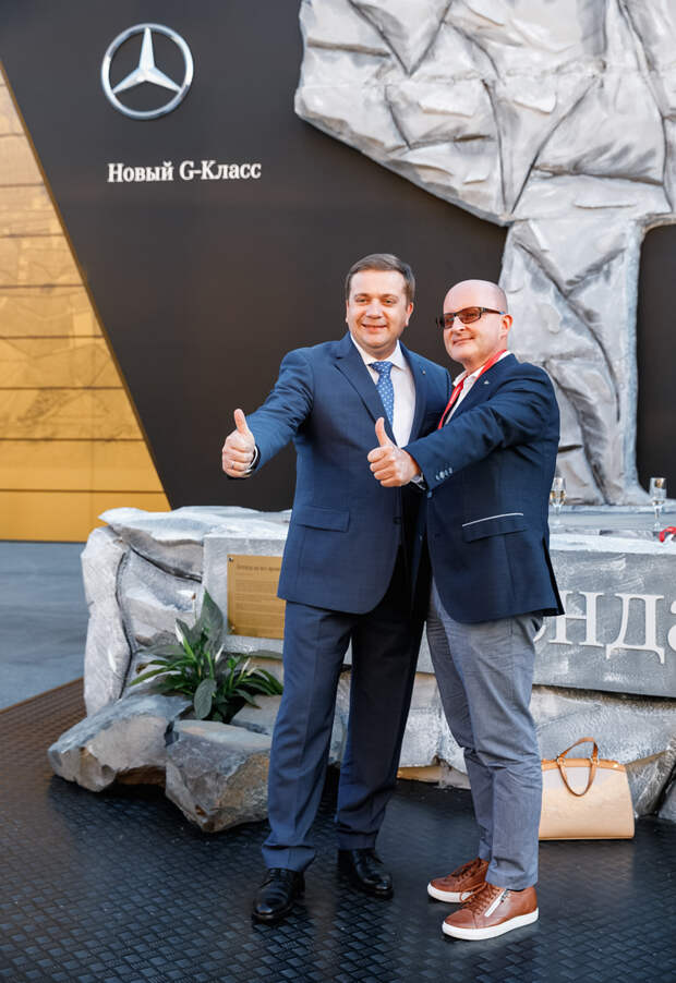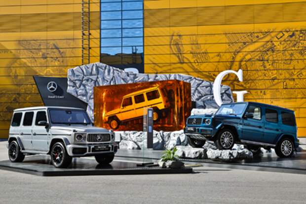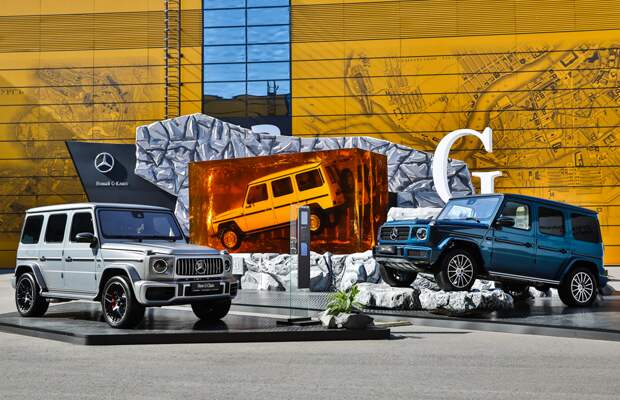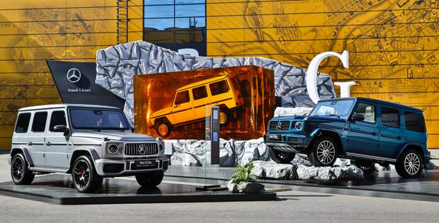 В честь юбилея сотрудничества на форуме была представлена масштабная арт-инсталляция: куб из янтарной смолы весом 50 тонн, в центре которого застыл Gelaendewagen 1979 года. Впервые удивительный экспонат публика увидела в Детройте на автомобильной выставке в январе этого года.Гостям ПМЭФ было предоставлено около 400 машин — начиная от бизнес-модели V-класса до премиального авто Mercedes-Benz S-класса. Среди них были и новинки: автомобиль S-класса Maybach, купе AMG S-класса и последнее поколение четырехдверного купе CLS. Кроме того, впервые в России было показано новое поколение G-класса — модели AMG G 63 и G 500.